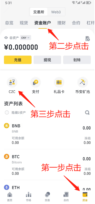 进入底部菜单资金——资金账户——C2C——进入交易