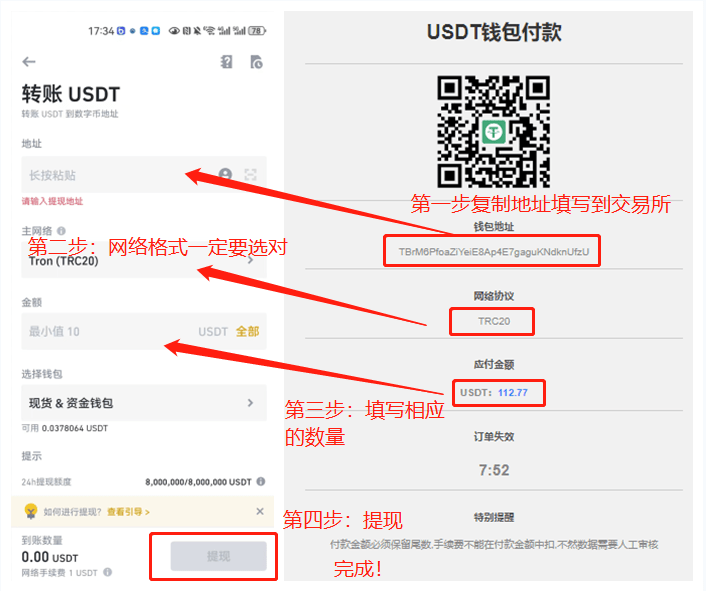 这里注意一下,转账要预留1~2.3U的手续费!!!如实际支付是112.77,则转账的时候要+1U,操作转账填写113.77才是准确的操作方式!!!